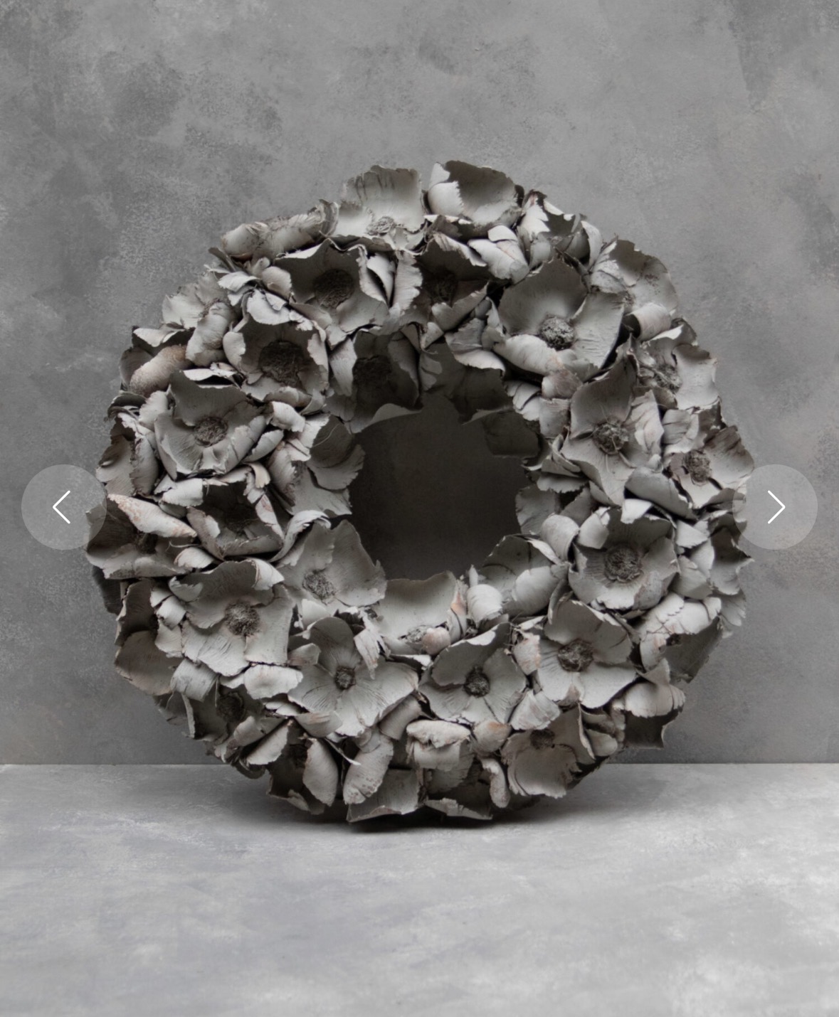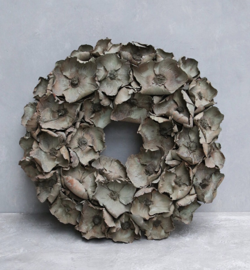 Krans met gedroogde palmbladeren, in de vorm van bloemen. Hang hem aan de muur, je deur of zet hem op een mooie schaal op tafel.