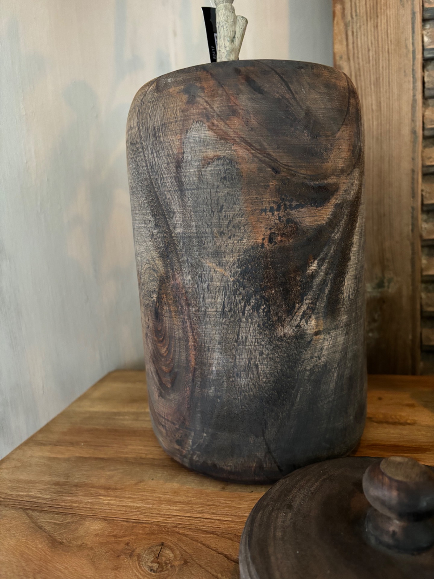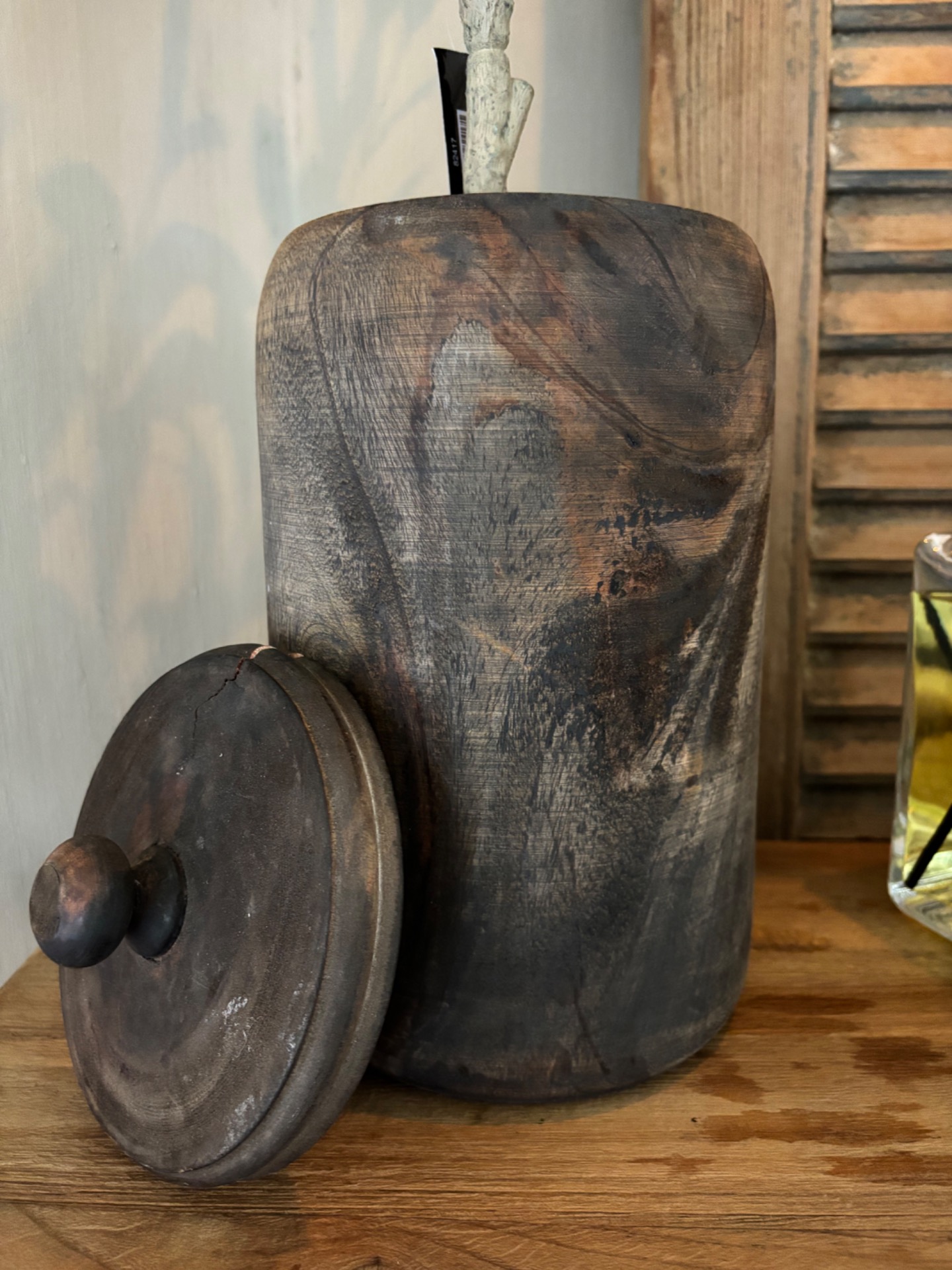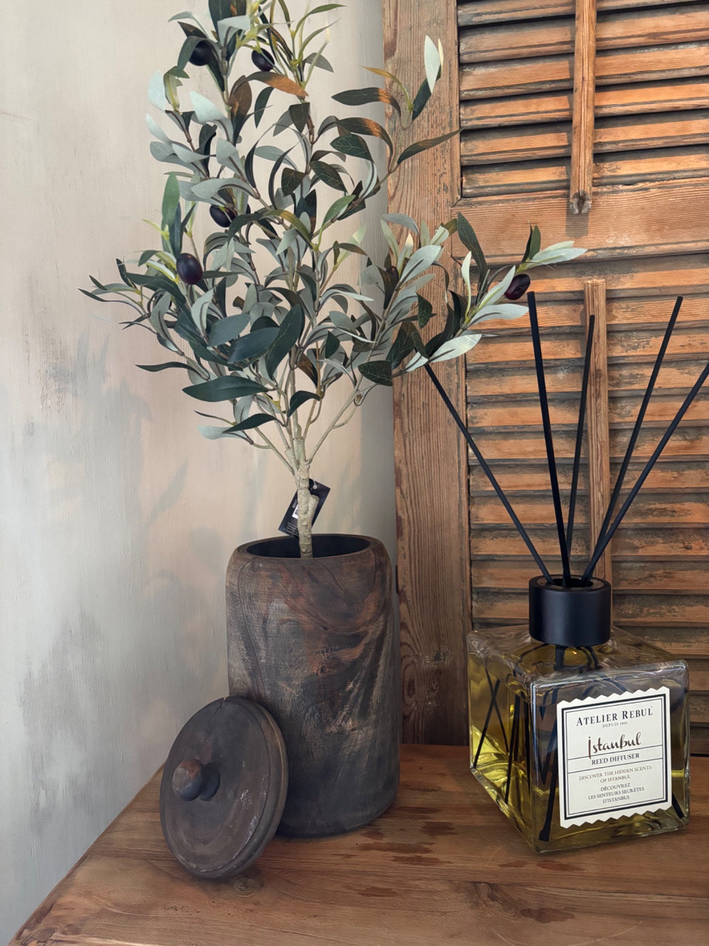 Decoratieve houten pot. Mooi met deze olijfboom M.Elke pot is anders.