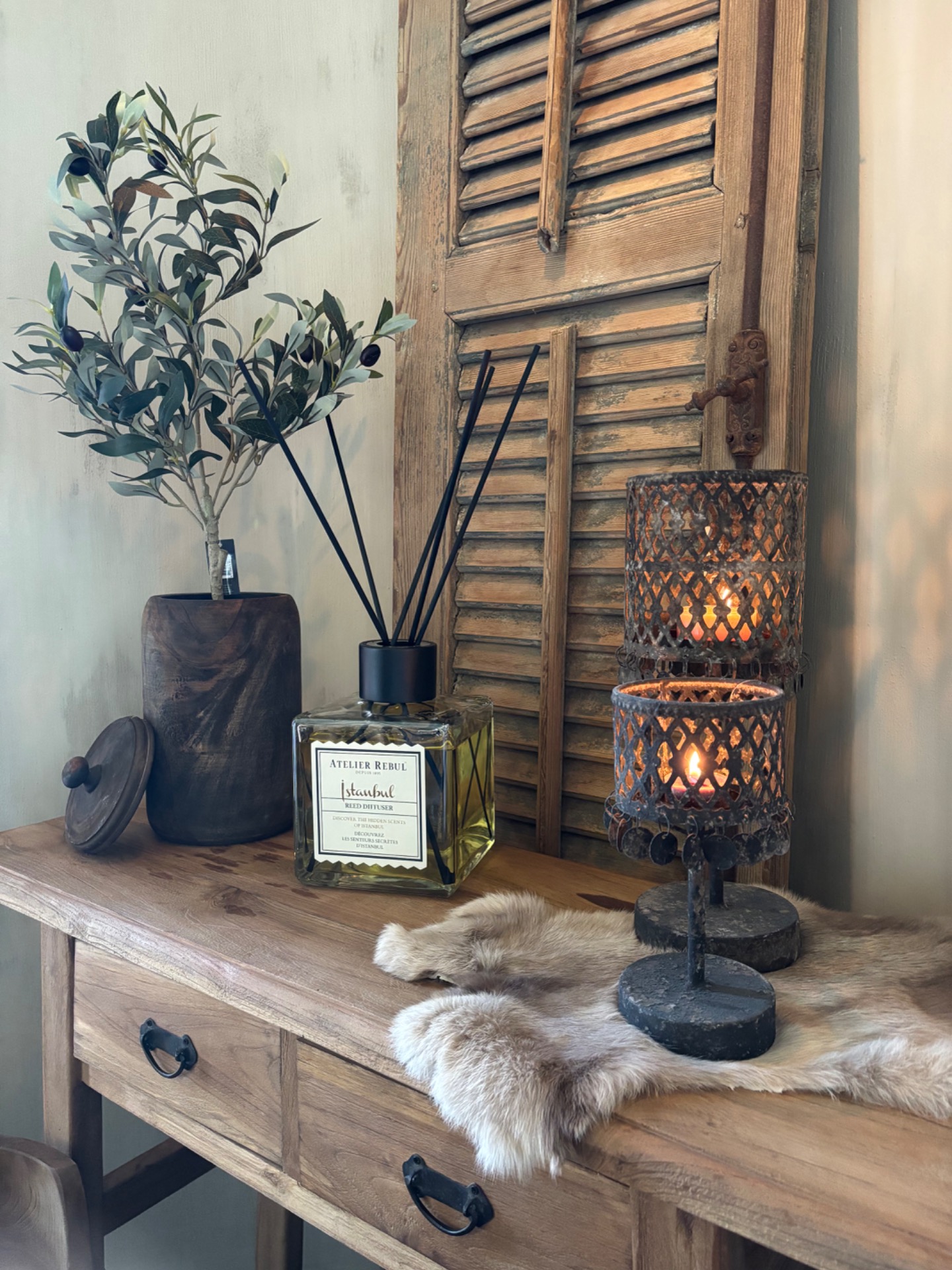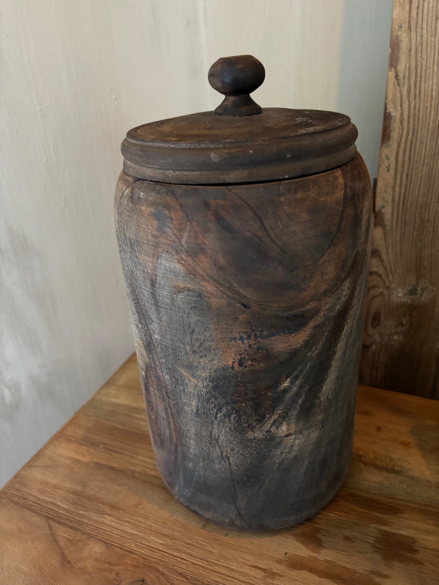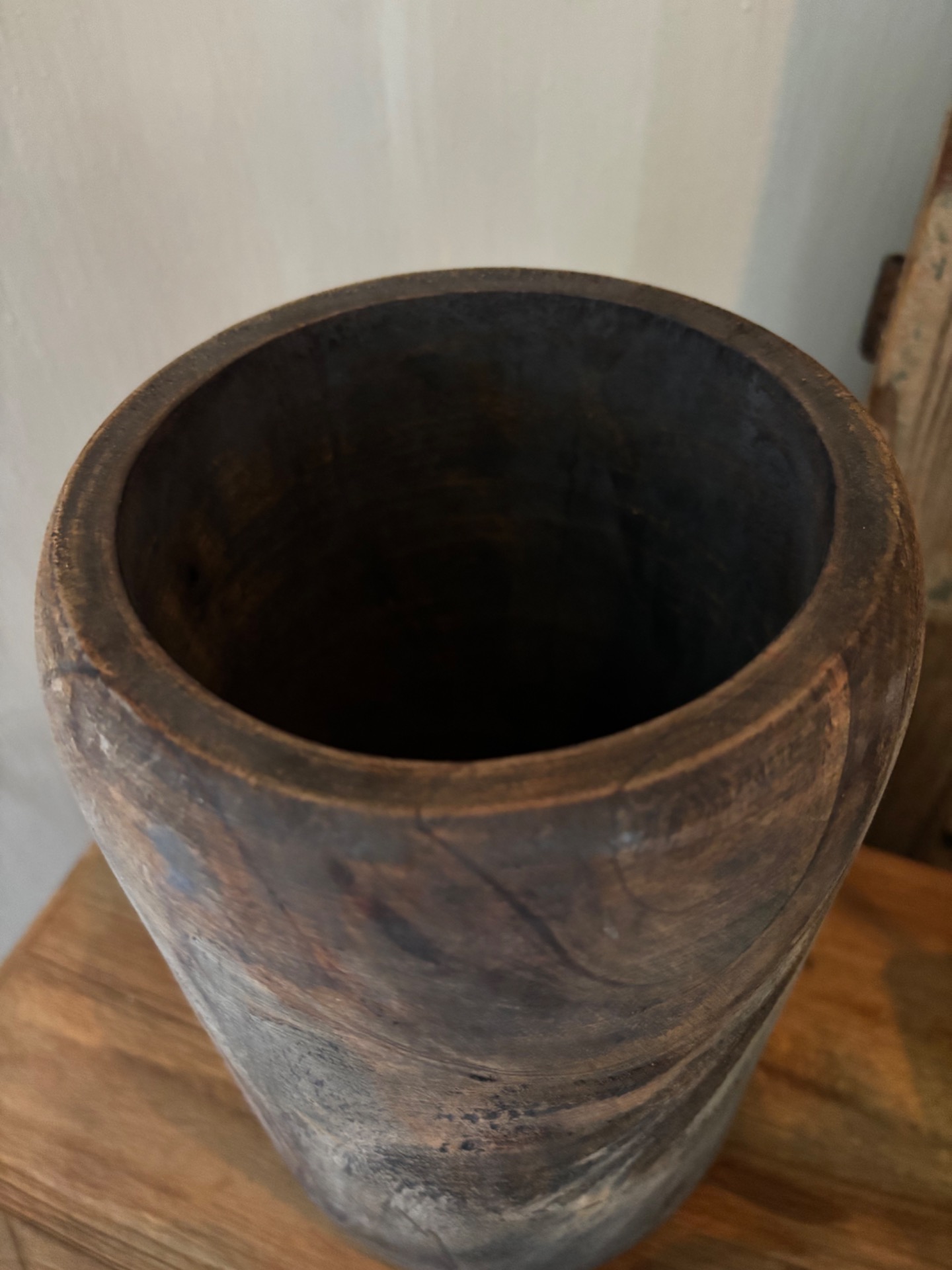 Decoratieve houten pot. Mooi met deze olijfboom M.Elke pot is anders.